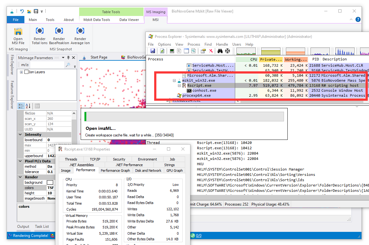 可以看得到,mzkit程序已经可以通过上面的代码,创建出了一个Rscript任务进程,正常的执行我们的质谱成像数据处理相关的计算任务代码了。