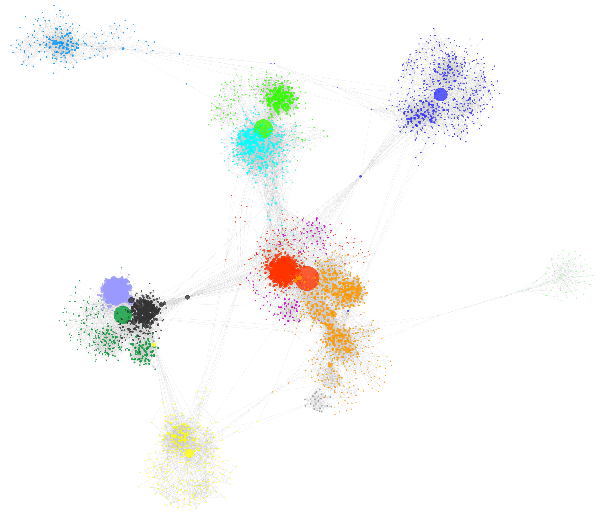 整个的计算过程非常的简单简洁。我们在完成了网络节点集群的计算之后,将网络模型导出为文件,送到Cytoscape软件之中进行可视化验证我们的计算结果。可以看见,我们的代码所实现的网络节点集群聚类的效果是非常的好的: