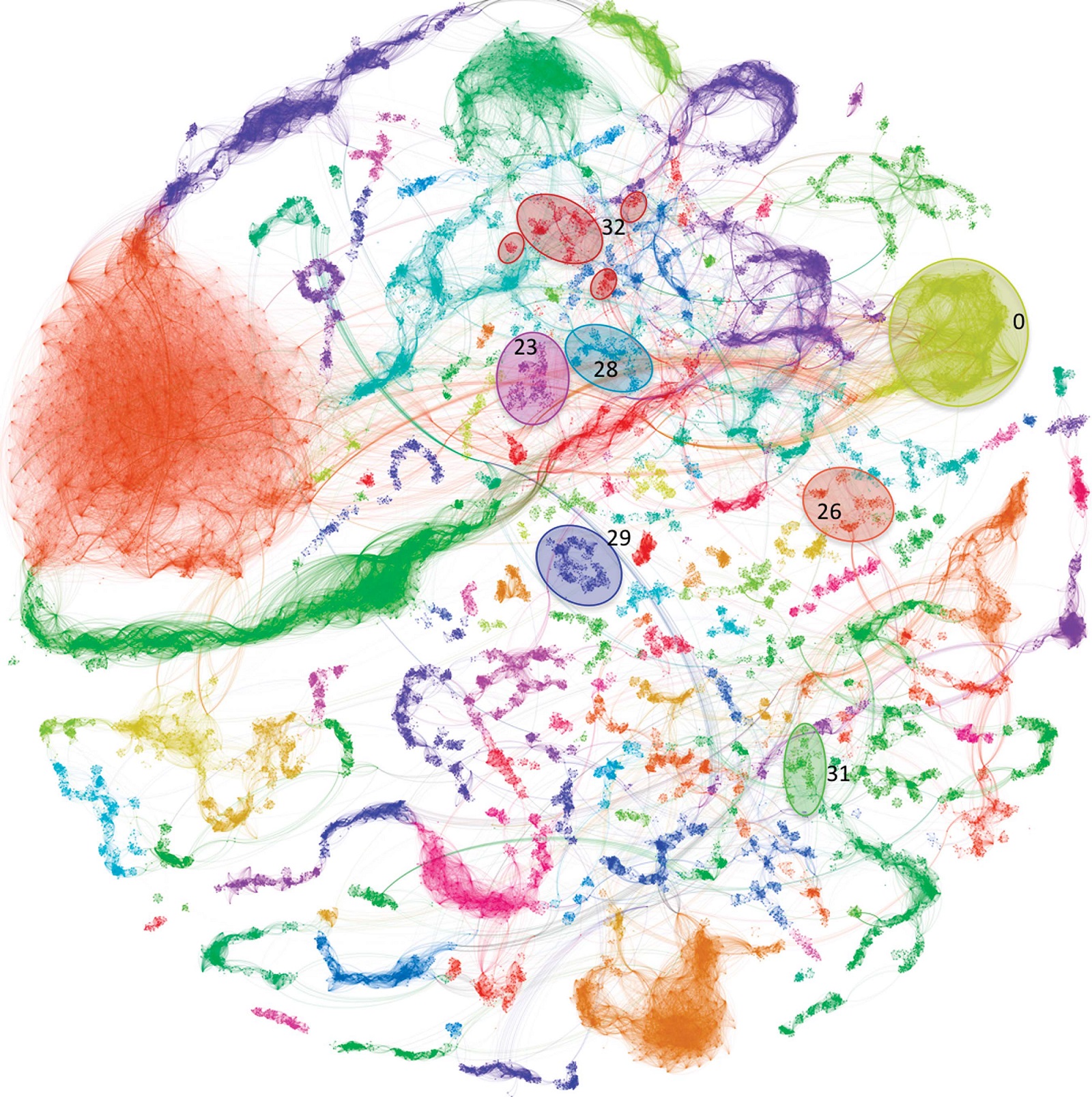 Figure 2 Metavirome network. A visualization of the all-verses-all BLAST network. Viral groups are assigned a unique color and were visualized in Gephi. Separation of the viral groups was accomplished using Gephi’s Force Atlas 2 plugin, a force-directed layout algorithm. Ovals highlight viral groups whose members matched against seeded viruses in a parallel network analysis. Despite the large number of seeded viruses (1812), only 26 viruses were assigned to viral groups. All 26 viruses were crenarchaeal viruses. Edge connections are lines connecting members within a viral group and between members of differing viral groups. Care should be taken to not associate distance between viral groups as indicative of sequence similarity. To enhance clarity and distinctions between viral groups, only those containing 50 contigs or more are included in the figure. Viral groups numbering: group 0 = SIRV-1,2; group 23 = ASV-1, SSV-1-2, 4-9; group 26 = ATV; group 28 = AFV-1; group 29 = STIV-1,2; group 31 = AFV2-3, 6-9, SIFV; group 32 = STST-1,2 and ARSV-1, SRV.