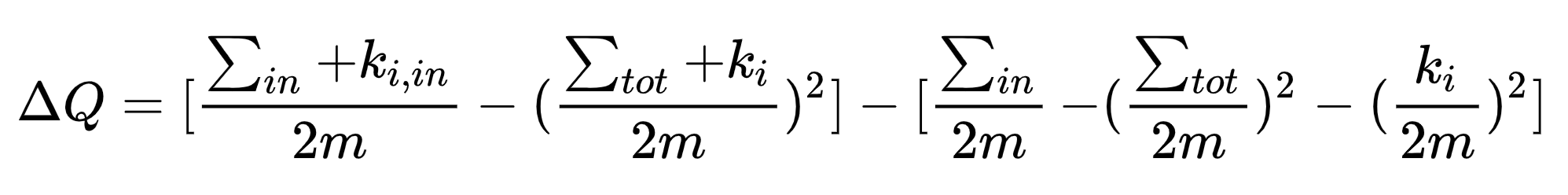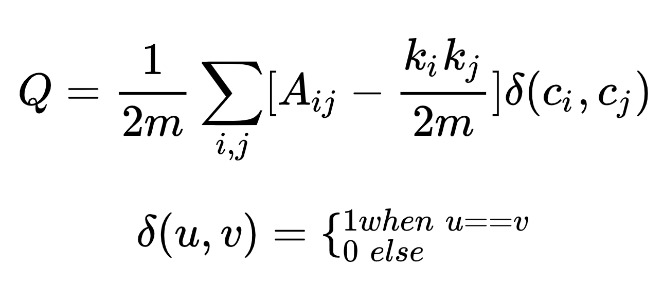 我们在计算完网络节点集群之后,下面就需要计算一下我们的集群模块划分的模块度来评估我们的计算结果。模块度是评估一个网络集群模块划分好坏的度量方法,它的物理含义是集群模块内节点的连边数与随机情况下的边数的差,它的取值范围是 [−1/2,1)。我们也可以理解其是网络集群模块内部边的权重减去所有与模块节点相连的边的权重和。对于无向图我们更加容易理解:即模块内部边的度数减去模块内节点的总度数。模块度的定义如下: