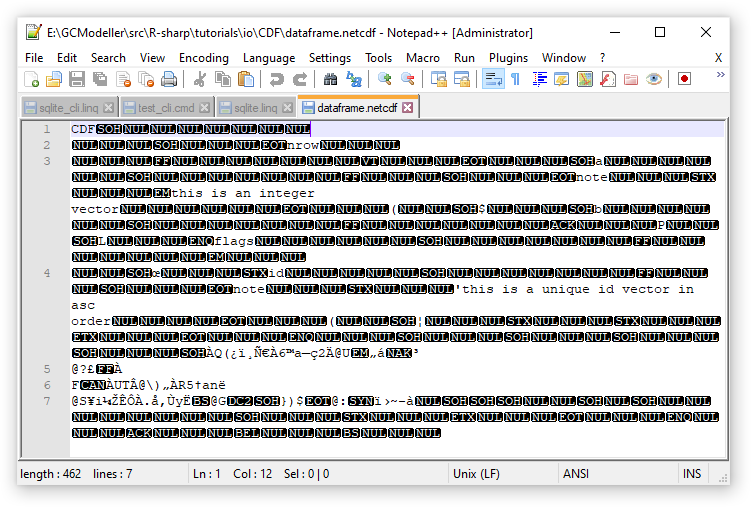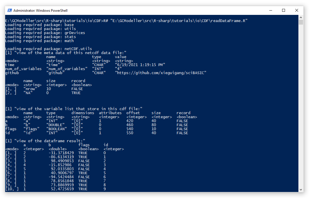 面对这个看起来一团乱的二进制数据文件,大家先不要头晕。我们可以通过下面介绍的R#脚本进行CDF文件之中的数据读取操作。在R#脚本环境之中,系统通过sciBASIC#框架自带了一个NetCDF文件的操作函数,这些操作函数都在netCDF.utils程序包模块之中。例如,我们通过下面的DEMO脚本来查看NetCDF文件里面的诸如:文件元数据信息,变量列表信息,获取变量的原始数据等操作: