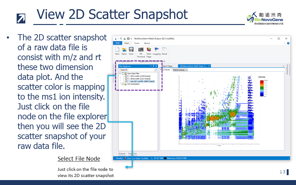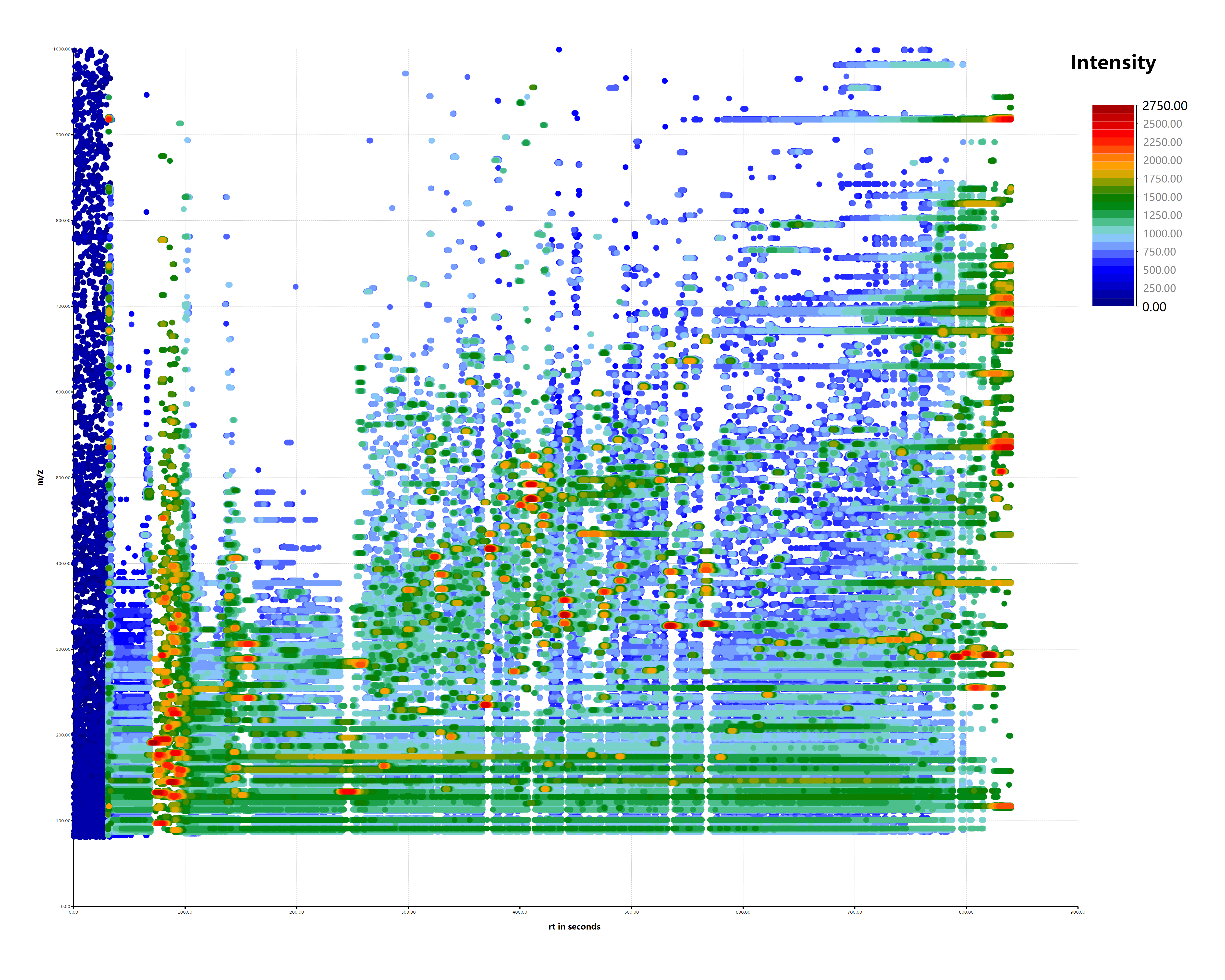 • 【散点图】散点图就是以[scan_time, m/z]为二维坐标点进行散点图的绘制,斑点的颜色则是通过数据点对应的intensity值映射到一个颜色等级上来完成上色的。在散点图之中,一个数据点就是一个一级母离子。