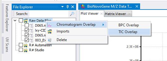 3. 最后,通过右键的上下文菜单,选择TIC或者BPC类型的色谱图叠加就可以查看对应的叠加图了。