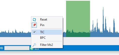 • 【Pin】菜单可以让我们根据这个选项的状态,以两种不同的模式进行操作:当处于Pin状态被选中的时候,我们选择保留时间范围不会修改色谱图浏览器的当前时间范围;反之当Pin处于未选中的时候,每做一次保留时间范围的选择,都会更新浏览器当前的保留时间的选择范围。