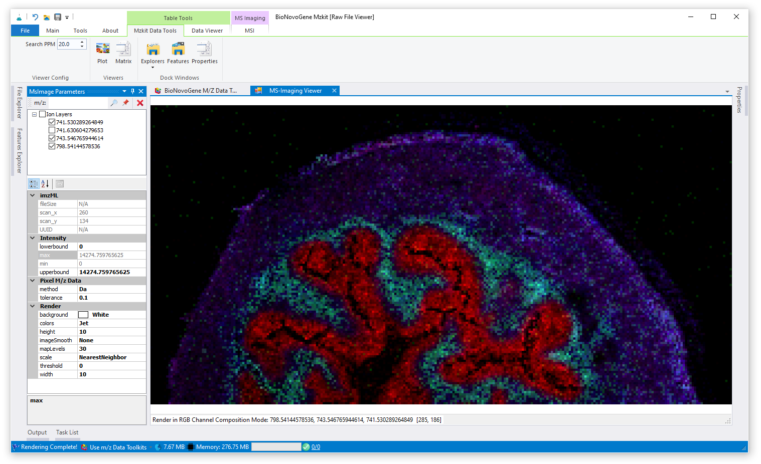 信号混合渲染模式就是将一个离子或者多个离子的信号分别归一化之后,进行统一缩放,最后映射到一个颜色谱之中产生颜色渲染。其相较于RGB通道叠加渲染,而言,成像结果更加明亮,一般会认为这种渲染模式下的成像图片更加好看。但是一般会因为颜色过多,在多种离子混合渲染的模式下,而无法正常的解释代谢物的表达上的空间分布。信号混合渲染模式对于单个离子的渲染是一种最优的选择。