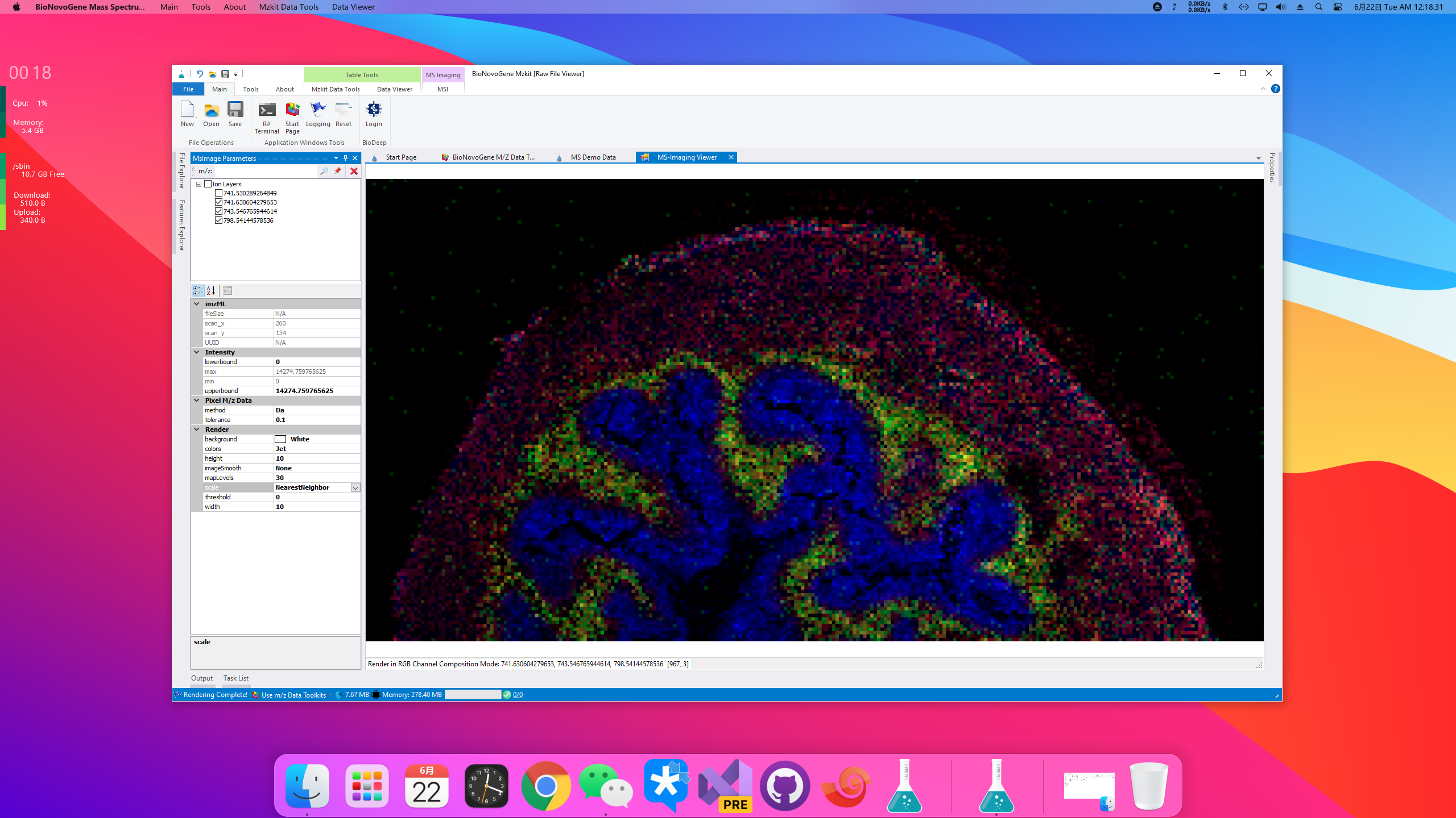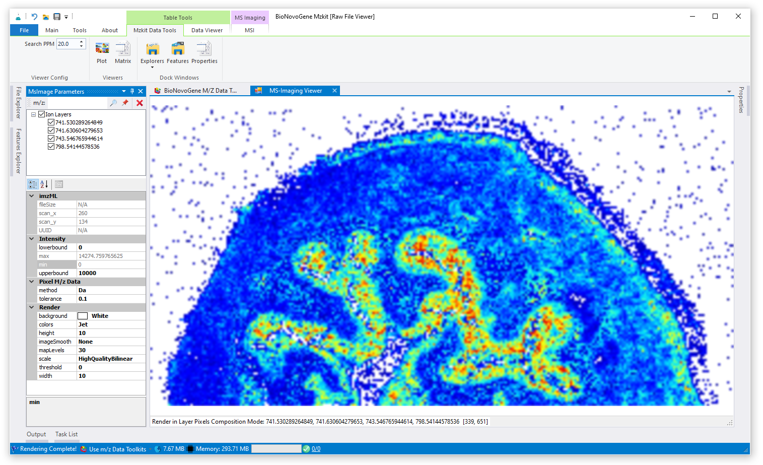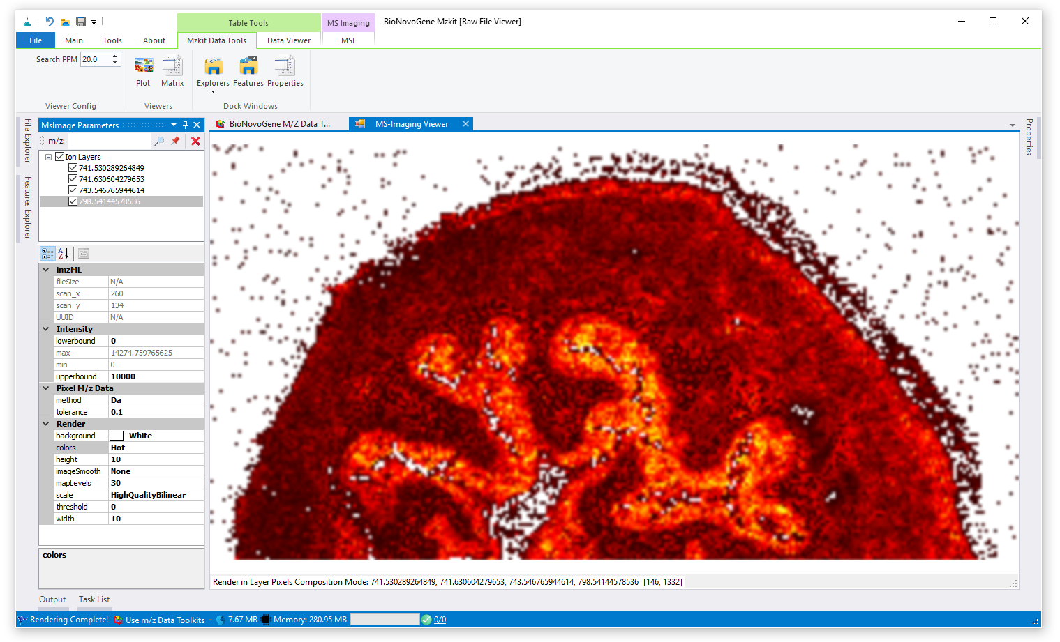 在加载原始文件之后,我们就可以选择离子进行质谱成像渲染了。