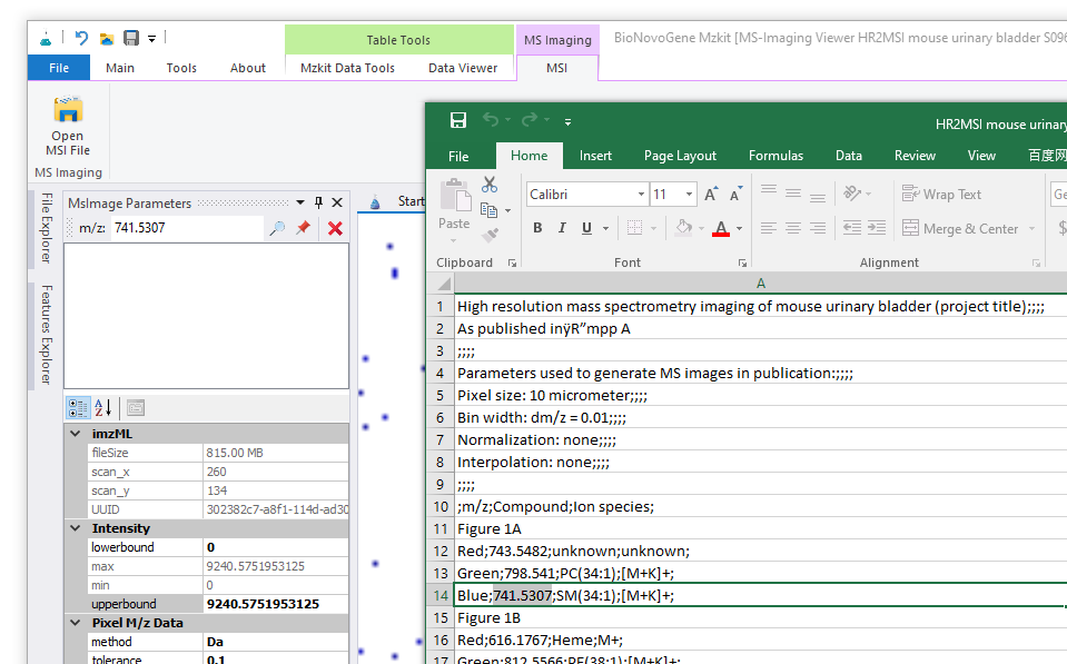 因为对于Raw文件而言,我们是需要换算才可以知道空间坐标信息的。而这个换算过程是必须要知道扫描斑点数的信息。所以假若我们通过Raw文件发表我们的结果原始数据,我们必需要将扫描信息编码进入文件名中,其他的同行才可以根据文件名中所提供的信息正确的查看我们的原始数据文件。一般而言,一个MSI原始数据文件的文件名一般为:<物种名/样本来源>_设备信息_像素宽度x高度_空间分辨率_mz范围
