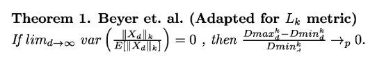 对于高维度的数据集而言,一般是包含大量零值的稀疏矩阵。即高维空间中数据样本极其稀疏。当维数很大时,独立随机变量的和在变量规模很大时,会向其期望的和收敛,就是向一个常数收敛。这个时候根据大数定理,以欧几里得距离为基础的相对对比度将会收敛于一个常数值零:
