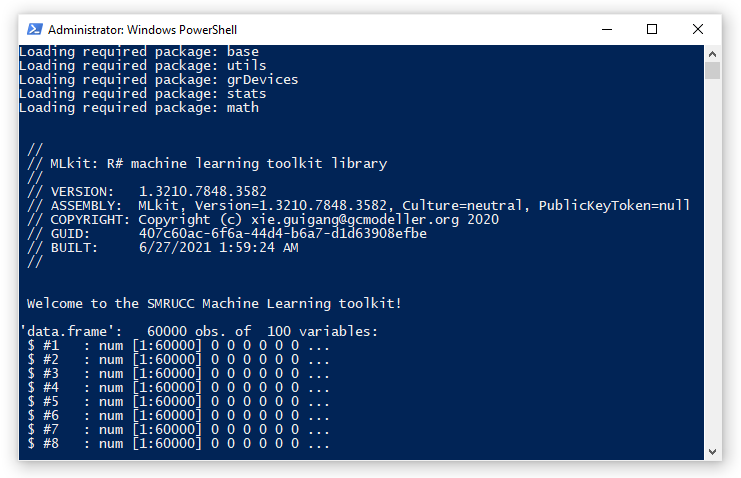 我们在这里进行DEMO的测试数据集是来自于著名的MNIST数据集。使用的是10x10像素的已经被打好标签的图像数据,总共100个维度,6万个数据。这个数据集使用messagepack格式进行保存,我们可以使用下面的R#脚本来简单的查看一下我们的测试数据集: