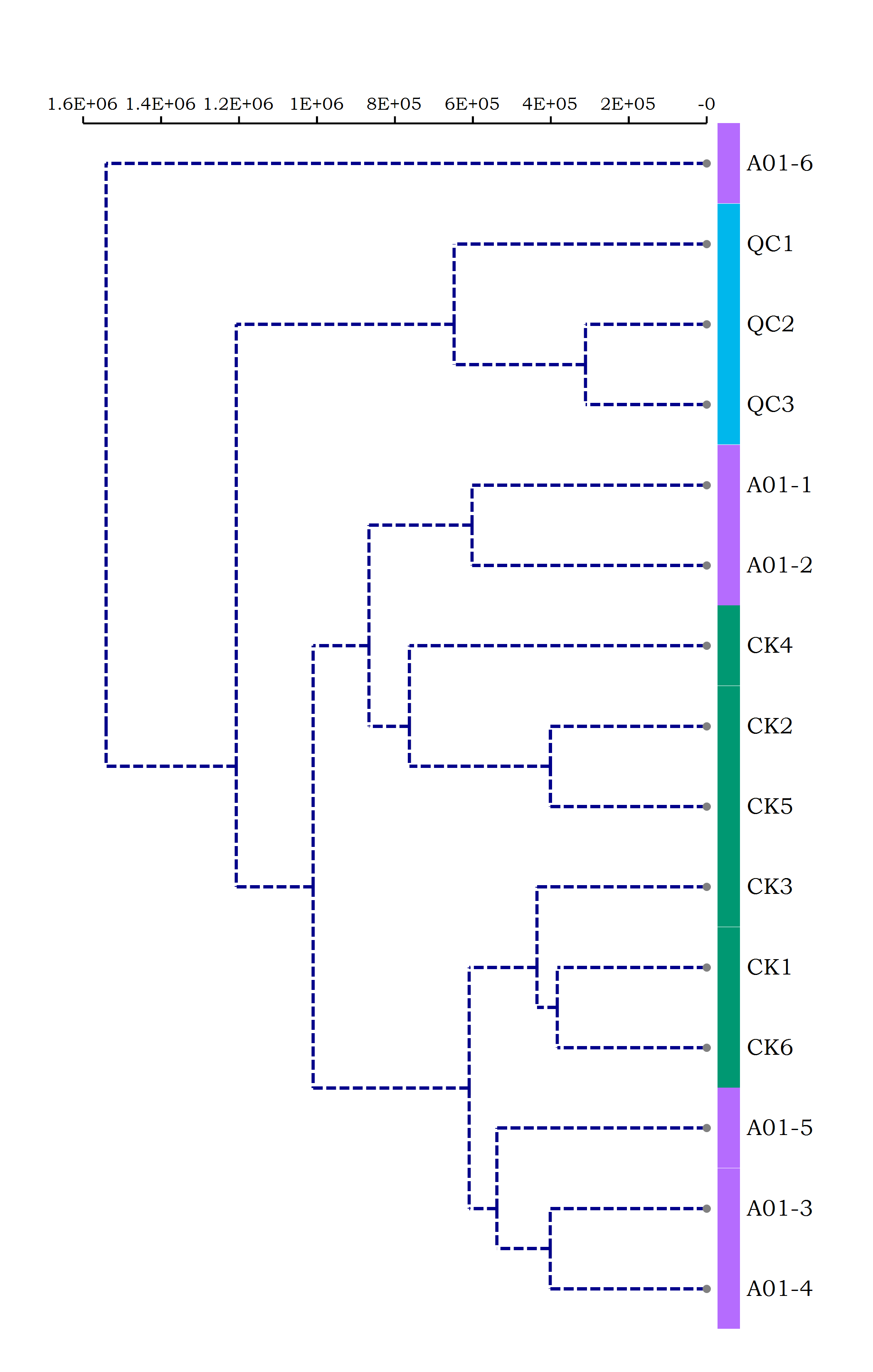 通过上面的层次聚类树可视化结果可以看到,QC样本可以很好的聚类在一块。这说明实验的系统误差比较好。CK分组的样本也可以聚类在一块,说明CK分组组内的差异比较小。对于A01分组而言,其在可视化结果之中被分裂为不同的分支,说明A01分组内的样本的重复一致性较低。
