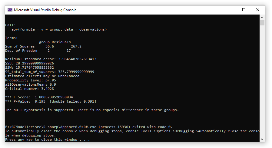 分别在RStudio环境中测试R语言的ANOVA以及语言环境之中测试自己所编写完成的ANOVA函数,比较二者的结果。可以从下面的测试结果之中看得到,我们所自己编写的ANOVA函数的输出结果与R环境之中的ANOVA计算结果二者保持一致。R#