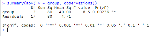 test = aov(observations, formula = v ~ group);