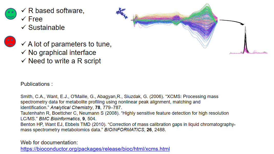 综合上面所列举出来的种种原因,在LCMS原始数据分析的最开始的第一步我们就会首先在代谢物的质谱检测信号分离方面遇到重重困难。但是好在我们目前的所有代谢组学的数据分析工作都可以站在巨人的肩膀上完成:经过前人在代谢组学数据分析领域内的大量工作,已经开发出了一些比较经典的质谱数据定量分析的软件包可以供我们使用。例如在目前主流的非靶向代谢组学自动化流程之中,一般是以R语言环境之中的xcms程序包作为质谱原始数据自动化处理的环境基础。