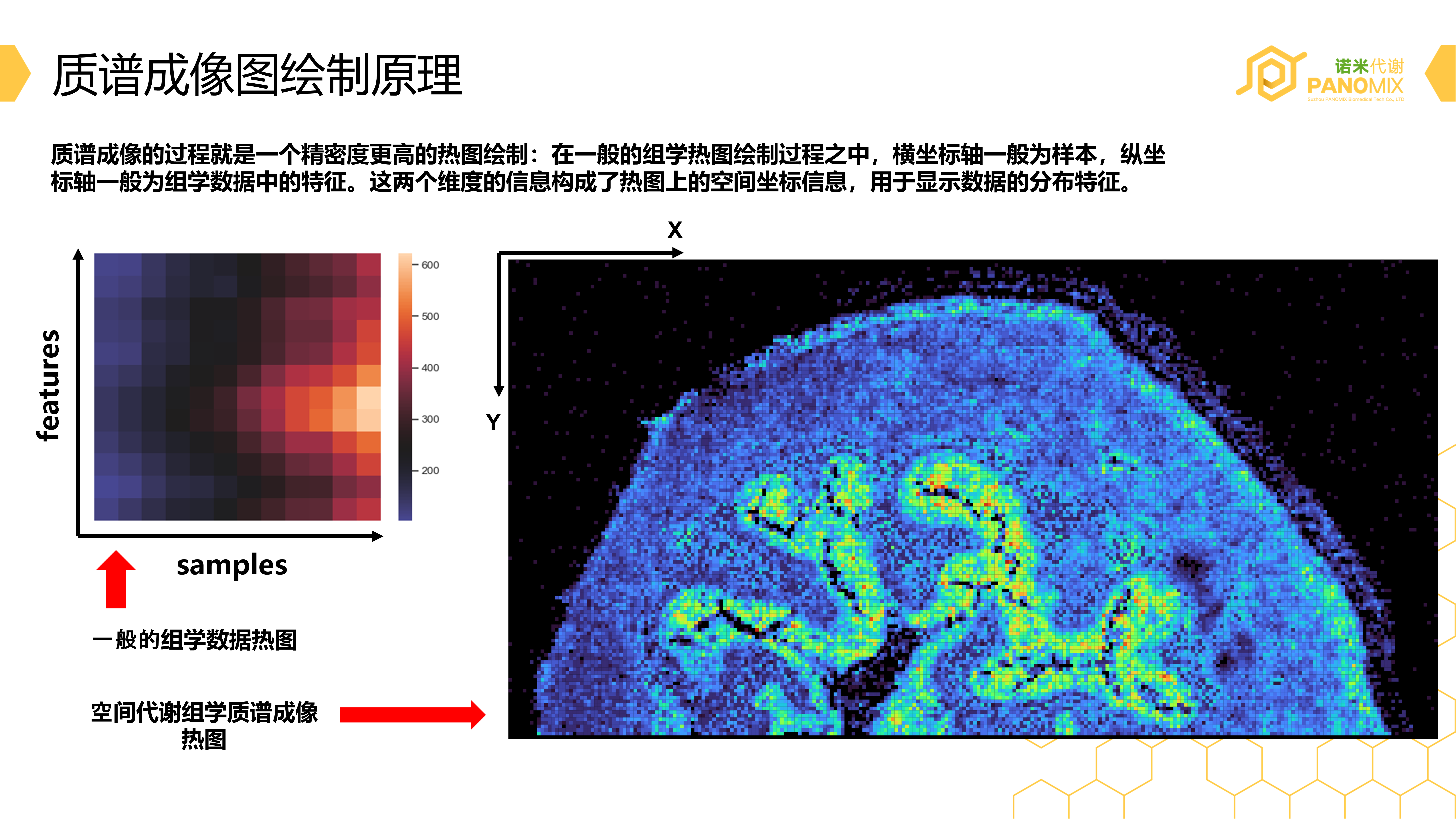 简单的来说,质谱成像就是一个更加精密的热图数据可视化。我们可以把热图中的表示样本的列看作为成像的二维图的X轴坐标,将热图数据可视化中表示每一个gene feature的行看作为质谱成像的二维图中的Y坐标轴。那我们从原始数据中按照遍历XY坐标点依次填充热图的单元格,生成热图的过程就是质谱成像的产生过程了。