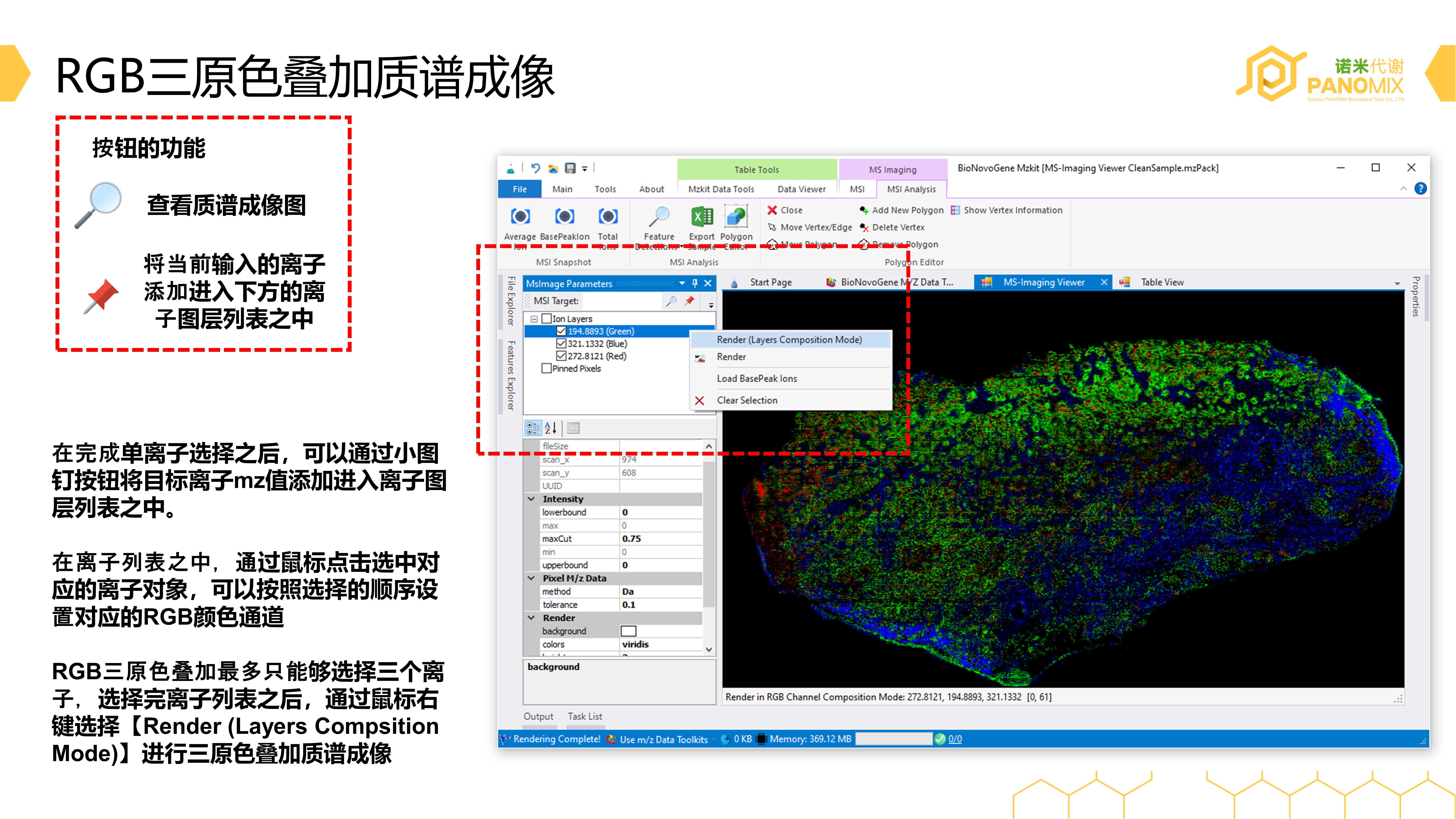 没错,上面的方法进行质谱成像可视化就是目前在杂志中经常出现的三原色离子叠加图。我们现在来挑选出三种离子,组合在一起进行三原色叠加,可以看见三种离子非常特异性的分布在了整个质谱成像图上的不同的部位区域之中。
