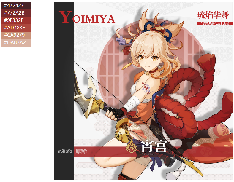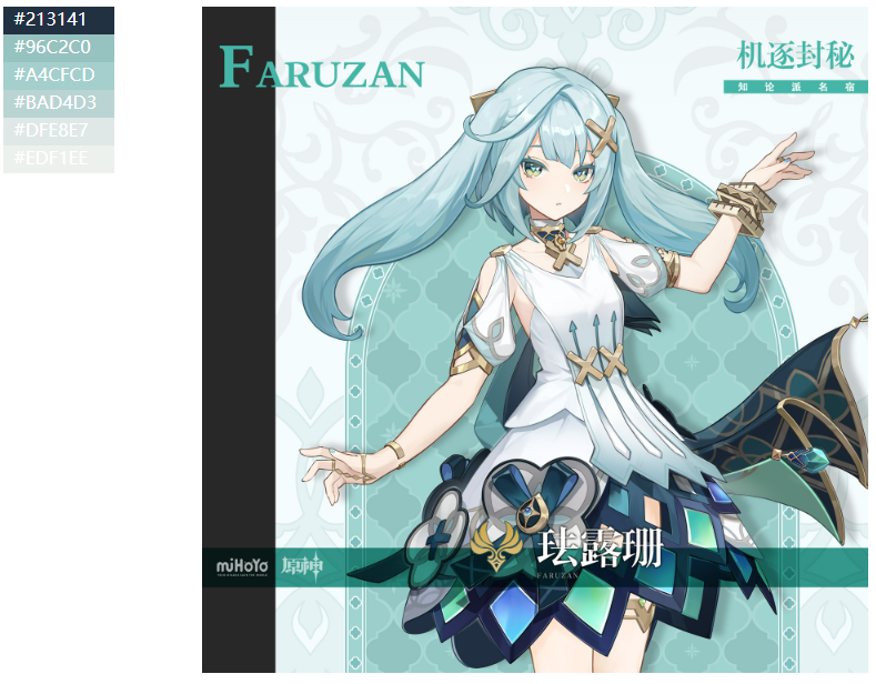 这样子,我们对上面得到的按照所出现的像素点数量进行降序排序的颜色列表,取出前6个这样子的颜色结果列表,就可以得到对应的原神角色主题色颜色版了。