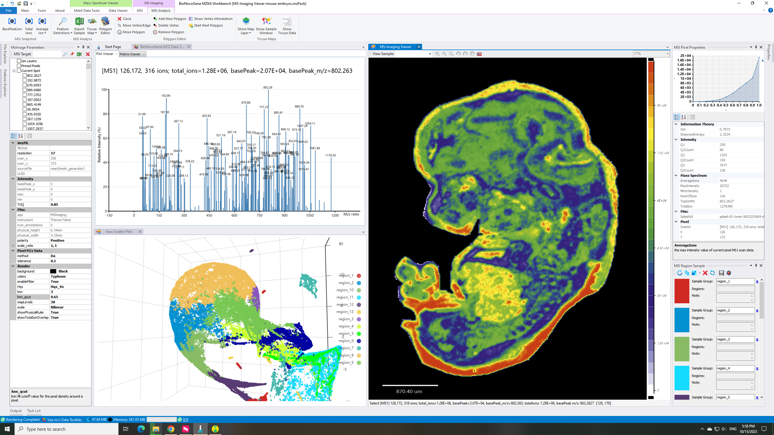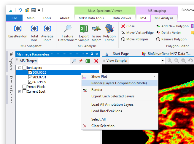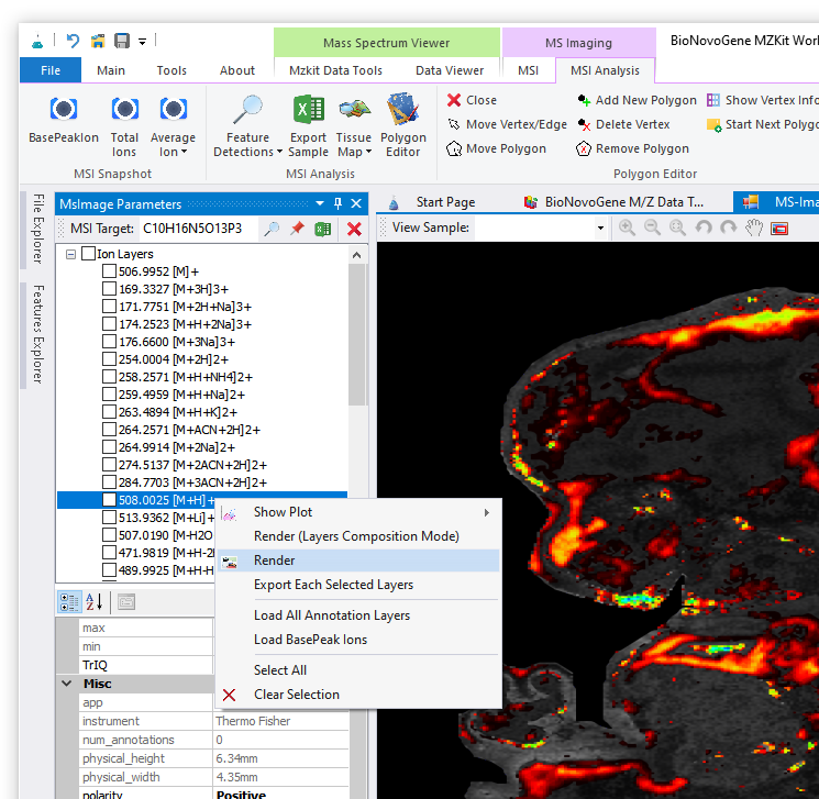 - 最后,选择一个计算出来的m/z值,通过鼠标右键快捷菜单中的【Render】菜单进行成像操作