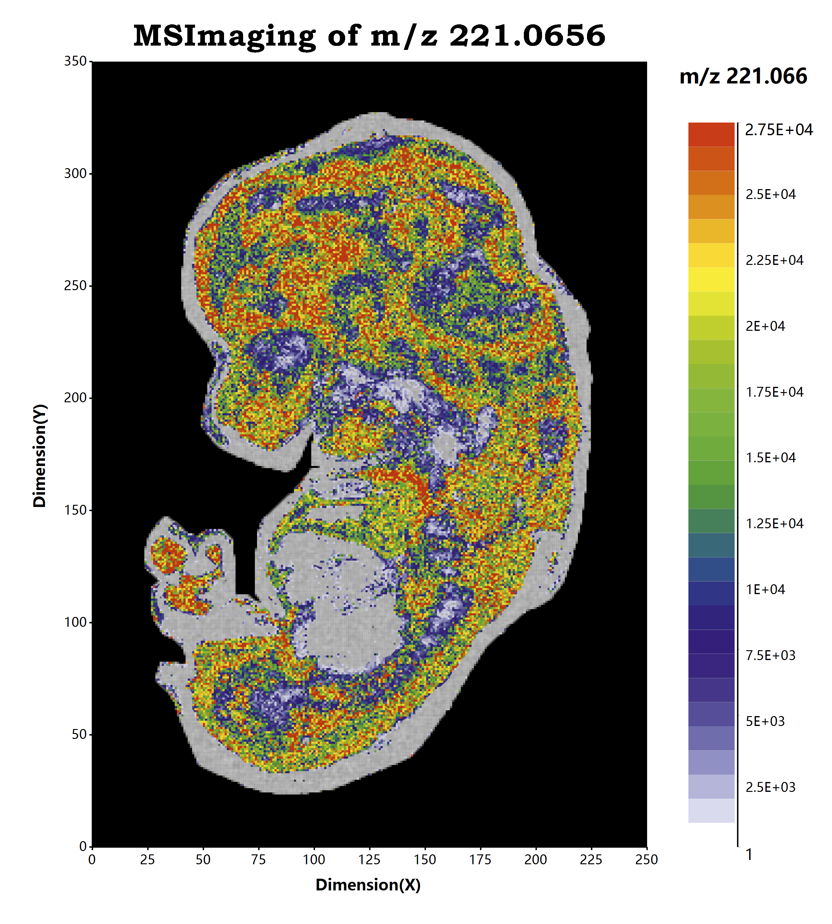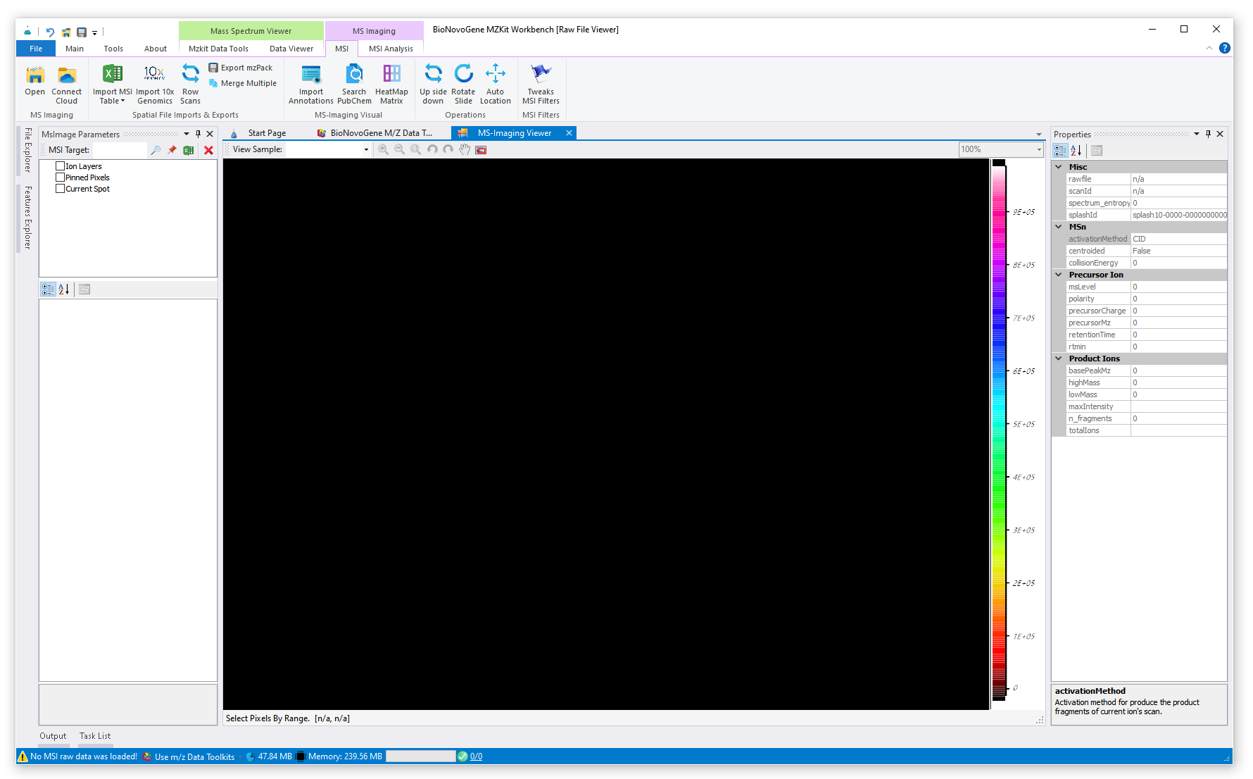 - 软件中间占据很大一块面积的黑色区域就是质谱成像的显示区域了,后续质谱成像的显示都是在这个区域内展示的。在这个区域内同时又可以分为左右两部分:左边的黑色部分就是质谱成像显示的画布区域,右边则是成像热图的颜色条和具体的离子响应强度值