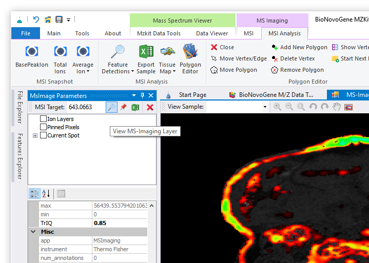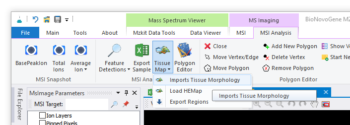 - 顶部菜单栏,主要有两大部分组成:【MSI】和【MSI Analysis】,其中第一组【MSI】菜单主要是应用于质谱成像原始数据文件的处理操作,例如:文件导入操作,文件导出操作,文件合并操作,文件数据旋转操作,质谱成像效果调整等操作;而第二组菜单主要是应用于质谱成像数据的一些简单分析处理操作,例如:获取文件中的离子特征列表,样本手动分区,导入和导出样本分区文件等基础的数据操作功能。
