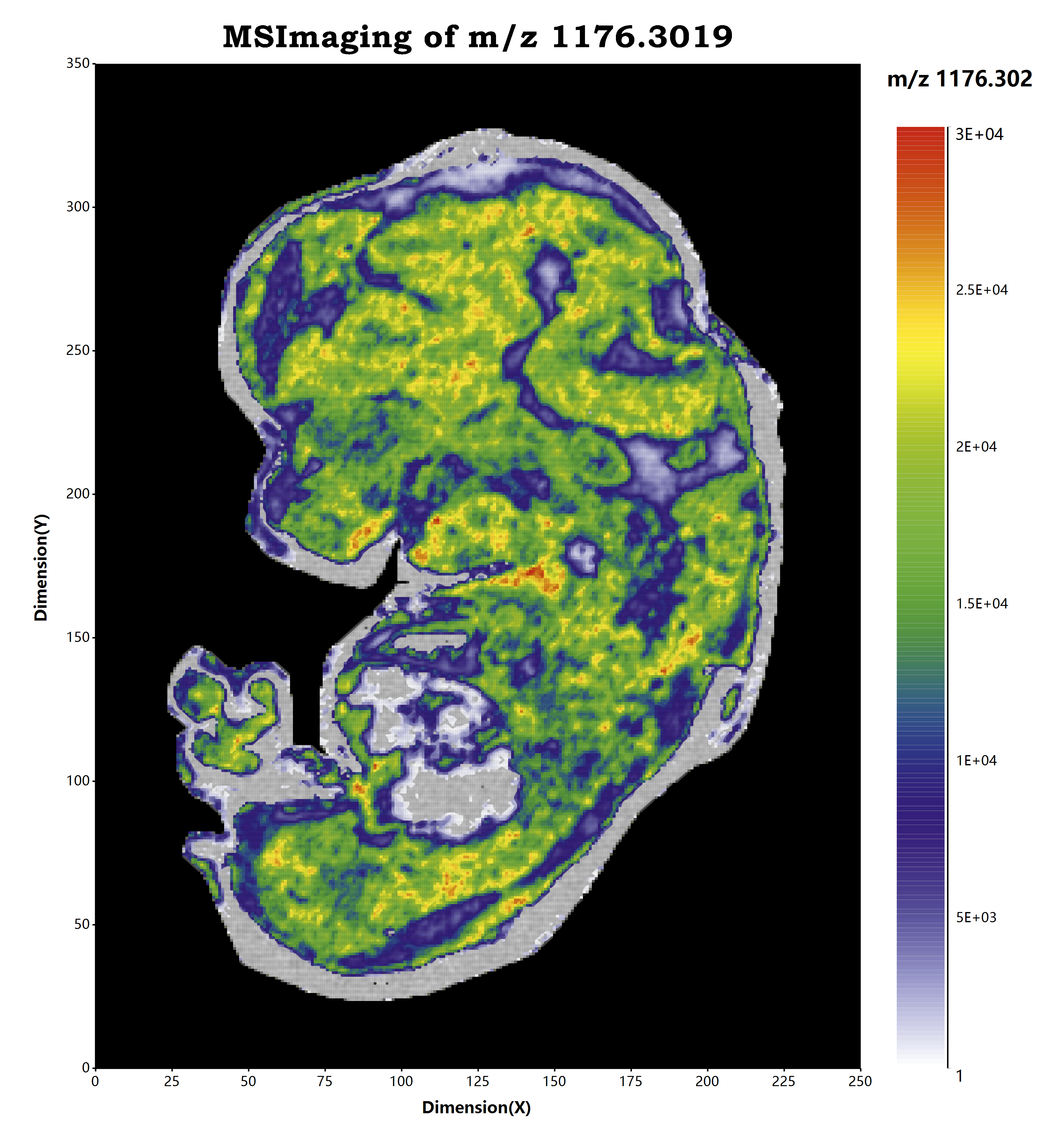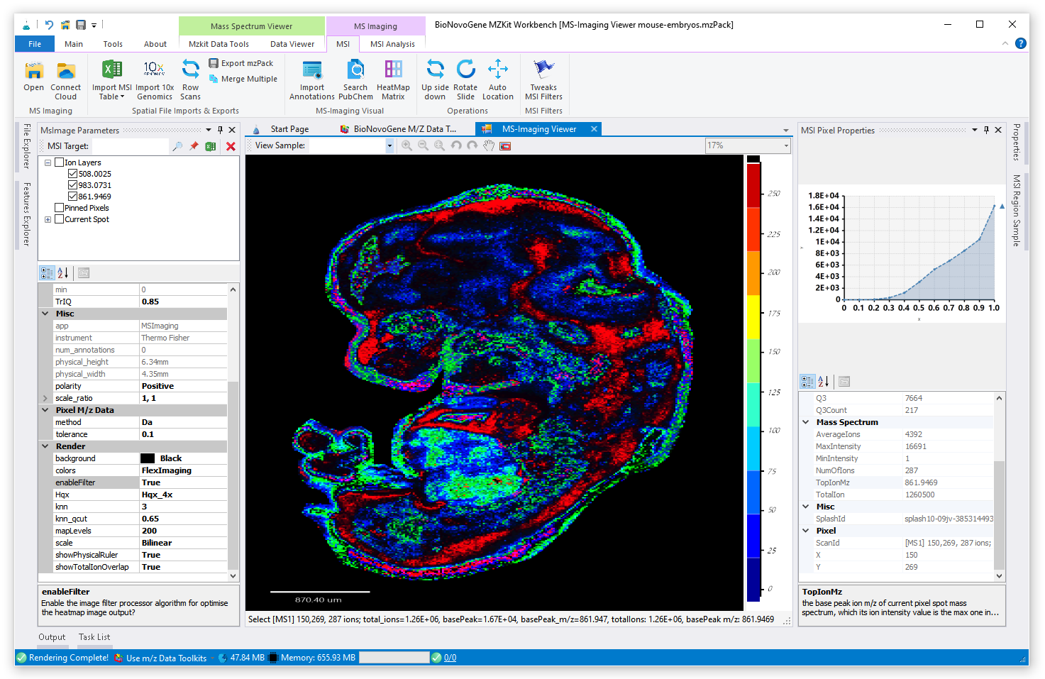 对于质谱成像可视化而言,其就是一个热图的绘制过程:我们将一定的离子图层信息提取出来,根据所提取的离子图层的信号响应度信息进行线性变换,映射到对应的颜色上,然后吧颜色显示到对应的空间坐标位置,就可以通过热图的方式吧我们的生物样本可视化出来了。在MZKit工作站软件之中,可以非常简单的进行单个离子的质谱成像,以及多个离子的质谱成像查看。