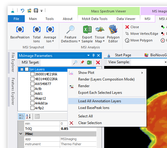 - 在完成了10x的h5ad原始数据文件导入操作之后,在【MSI Parameters】窗口之中,通过鼠标右键菜单【Load All Annotation Layers】操作加载基因注释列表