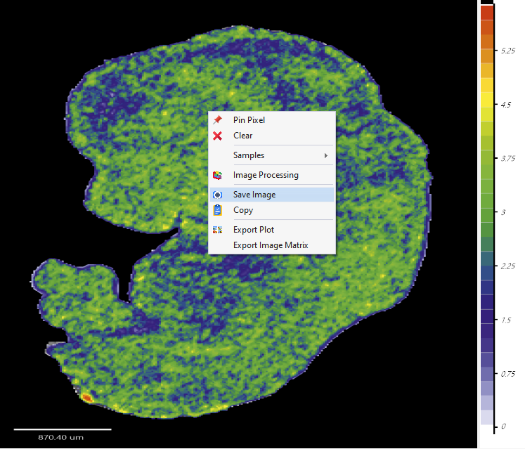 那,前面我们很详细的介绍了成像图的生成以及相应的个性化调整操作,那如果我们需要将调整好的成像图保存为文件呢?这个时候我们可以通过显示空间成像热图的画布上的右键功能菜单来完成了。一般而言,我们可以通过下列方式导出我们的成像图结果: