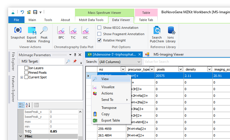 - 最后我们可以通过表头选中某一个离子的行数据,通过右键快捷菜单的【View】操作查看目标离子mz的质谱成像图