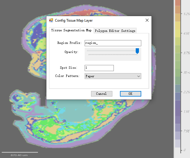 如果想要修改查看的空间分型图的透明度或者绘制的斑点大小,可以点击【MSI Region Sample】窗口中的【Config Tissue Map Layer】按钮,打开配置对话框。在对话框中修改【Opecity】或者【Spot Size】参数值即可。