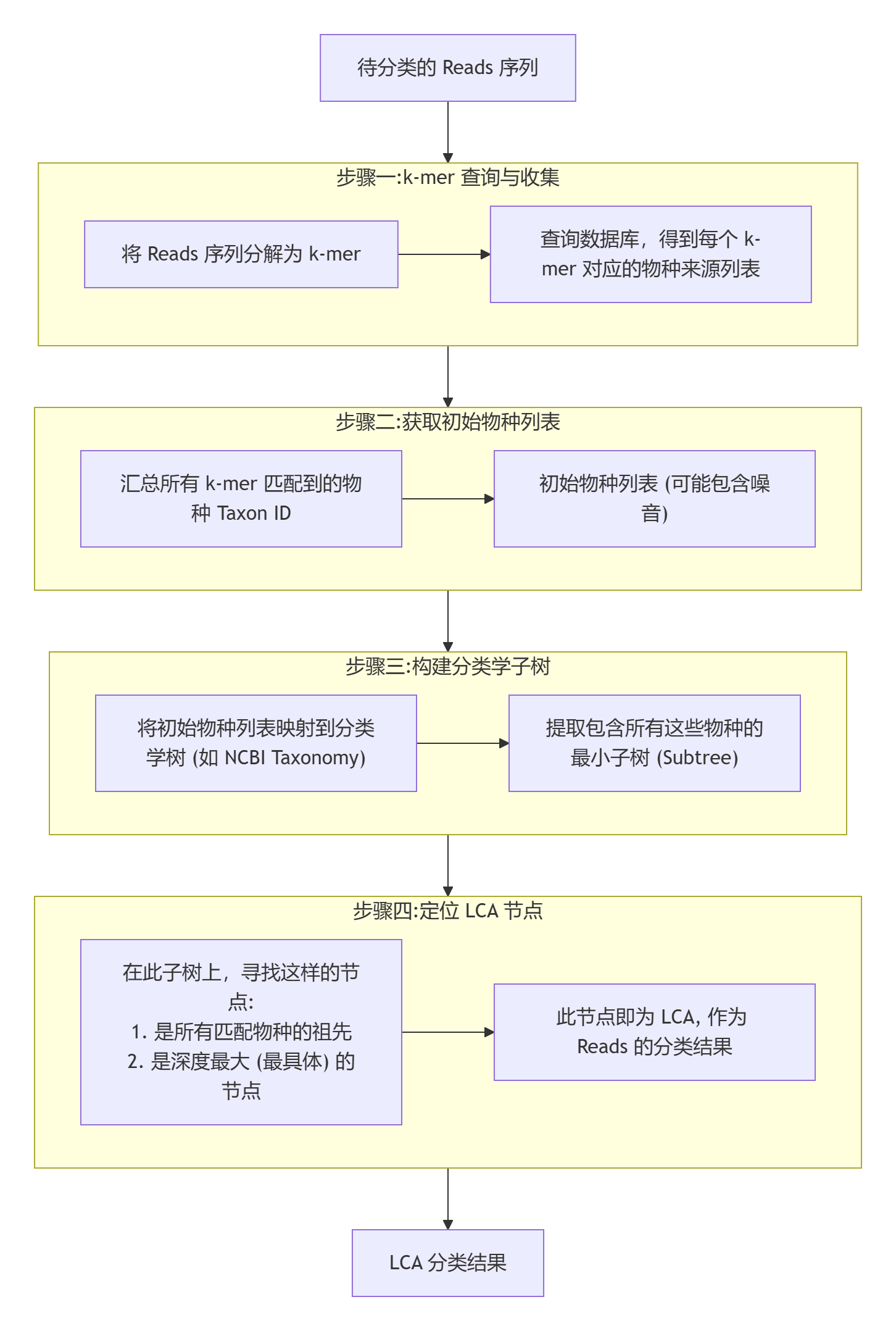 从上面的流程图可以看得到,现在假设我们需要针对某一条测序reads序列结果做物种来源分类,则首先需要针对这条reads序列进行kmer的提取,然后进行数据库查找,得到所有的kmer可能的物种来源信息。那现在每一条待注释的reads就可以基于kmer数据库的查询结果得到了非常多的物种来源结果。最后,我们就可以基于LCA算法从得到的物种来源列表做注释推断,通过查找他们的最小的公共祖先分类,得到了这条reads的具体物种分类结果。